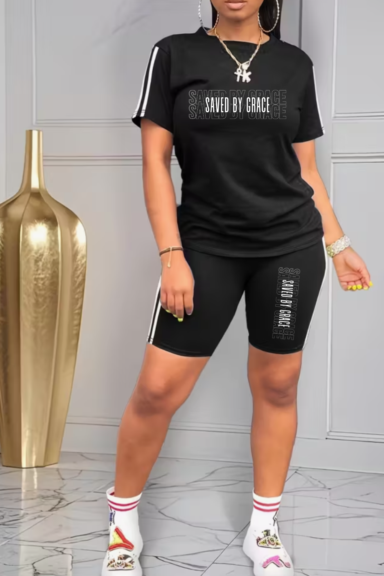 Step out in bold faith and effortless style with our women’s 2-Piece “Saved by Grace” Short Set designed for the woman who knows where her strength and salvation come from. This comfortable, breathable set includes a relaxed-fit T-shirt and matching shorts, both featuring the powerful declaration: “Saved by Grace.”